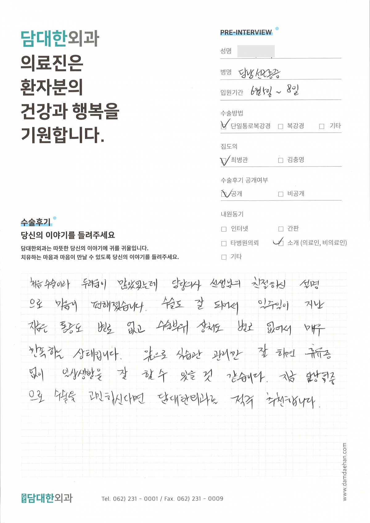 수술후기는 담대한외과에서 수술하신 환자분들이 직접 작성해주신 내용을 작성자의 동의하에 본 게시판에 게시합니다.