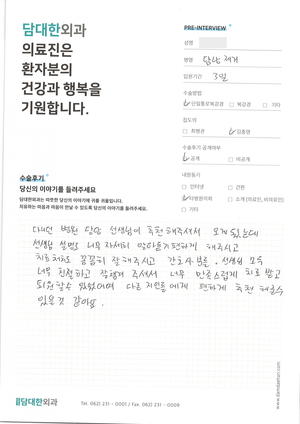 수술후기는 담대한외과에서 수술하신 환자분들이 직접 작성해주신 내용을 작성자의 동의하에 본 게시판에 게시합니다.